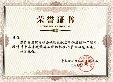 经过建设单位,全过程工程咨询单位,工程总承包单位等各方共同努力下,本项目获得《青岛市建筑施工现场标准化管理示范工地》荣誉证书。